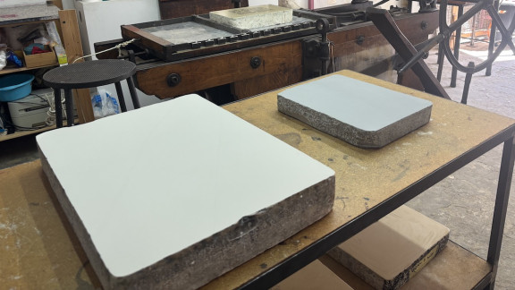 Detall de la pedra calcària sobre la qual es produeix la impressió litogràfica. Foto: Jordi Ubach